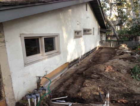 The bottom left picture (where you see black) illustrates where a removed concrete retaining wall was previously installed against the house. In front of this wall was a brick planter. The black you see is what remains of tar that was used to seal the stucco prior to installing the wall and brick planter. It should not be surprising that it did not work.
